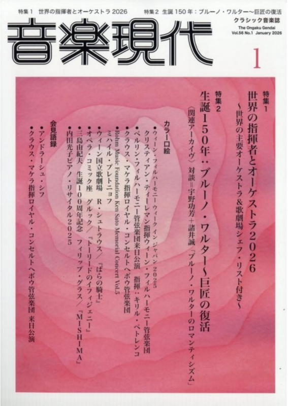 | 音楽現代 令和8年1月号 | 音楽現代社 | 2026/1 | 生誕150年:ブルーノ・ワルター〜巨匠の復活 ・ブルーノ・ワルターの生涯と芸術 / 浅岡弘和 ・トスカニーニ、フルトヴェングラー、ワルターがいた時代 / 宇神幸男 ・ブルーノ・ワルターを識るCD&DVD / 野崎正俊) ・〈関連アーカイヴ〉対談=宇野功芳+諸井誠「ブルーノ・ワルターのロマンティシズム」 |