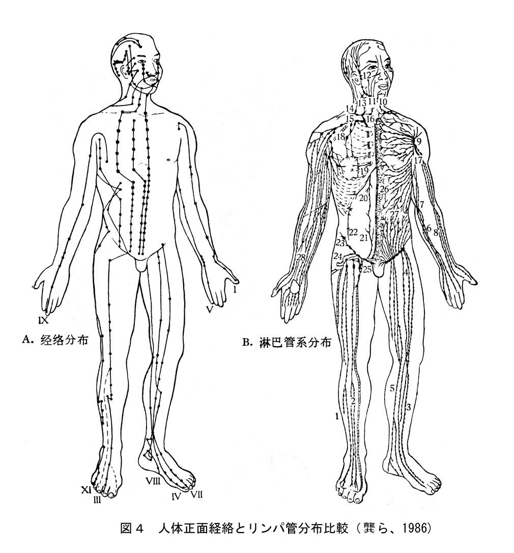 中国において龔ら3)は肉眼解剖学的にリンパ管の走行と経絡の走行の類似性を指摘し(図4)、また、下腿胃経上における循経感伝現象の走行とリンパ管の走行との関連を報告している。さらに、上肢急性リンパ管炎の走行と心包経や心経との走行が一致すると述べている。日本においても亥口ら4)が上肢と下肢の急性リンパ管炎6例を挙げ、その走行と陰経の経絡の走行とが合致するとしている。