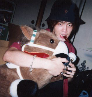 | 俺2(爆) 酒入ってます。微妙に目が据わって見えるのはそのせいなのでしょうか。 撮ったのは・・・2000年の9月デス。このページ作り始めたのも9月だから、それなりには新しい。 小物を良く見てみましょう・・・馬の手に持たされているのはキリン! そして口にくわえているのはビーフジャーキー! んで、帽子は友人の「幸太」からの借り物(爆) はい、場の雰囲気がよくわかりますね。 ちなみにこの馬の名前はミホノブルボンだそうです。 |